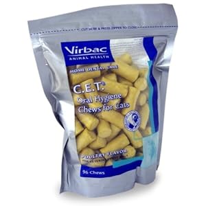 CET Chews for Cats (poultry flavor)is an outstanding treat among our cats who now let us know when it is time for their dental treat. If we run out before the new shipment we get sad eyed looks, loud cries, and all the while following us around the house. Also far less plaque buildup - even on our Tonkinese and Abysinians - means fewer trips to the vet.