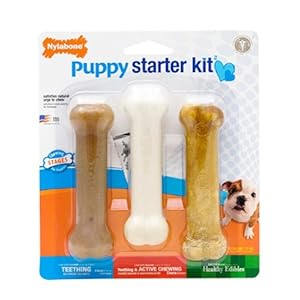 I got my 3 month old puppy this starter set. Like most reviewers, my puppy:a: chewed on the flexi-chew chicken bone for a long timeb: ignored the white durachew bonec: devoured the edible chew bacon boneI will definitely buy her the flexi-chew bones. People are right about the pieces breaking off in chunks larger than `rice' size, but the package says that "rice-sized pieces should pass." I don't think that means it will break in rice-sized pieces; it means that in the event a rice-sized piece breaks off and the dog swallows it, it should pass...should I type rice-sized piece one more time? I just did. My pup chewed off pieces that were consistently larger than rice-sized (Oh! Did it again!) and spent a good 5min. trying to chew each piece down if I could not stick my fingers in her throat to grab it. I crate my pup and would not let her have this bone in the crate because of the pieces that break off. Also, it is down to a size that would easily fit in her mouth so that she could attempt to swallow, which means it is going in the garbage for a brand new one.The white durachew bone will be saved for when she has her adult teeth and wants to chew on something forever.The edible bacon bone will be left in the wind since she gets treats as it is. I was honestly thinking, "WTF?" when she crushed it in 5min until I realized it was the edible chew. She loved it, but it might've spoiled her dinner...probably not, but still...it's funny to think that.Anyway, is it worth it to get this pack? Yes. One Nylabone is about $4. You get this pack for about $7. If your pup doesn't go for the durachew now, s/he will in a month or 2 (depending on age). You can also see how your pup reacts to the bacon bone: okay potties or loose potties. Then, you have an idea of where you should you invest your money.