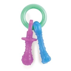 Puppy Teething Pacifier (X-Small): This chew is made from soft, flexible material and is specially designed for teething puppies who have not formed their adult teeth. It encourages puppies to develop non-destructive chewing habits while it helps to clean teeth and control plaque and tartar build-up . The Puppy Pacifier features a ring and two chews.